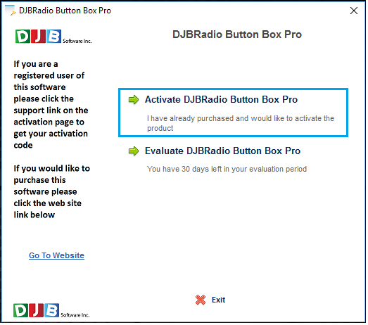 Select the Activate DJBRadio Button Box Pro after you have purchased the BBPro software.