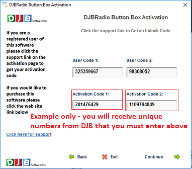 Figure 3: DJB Activation Screen, Users must enter codes emailed in text box as above