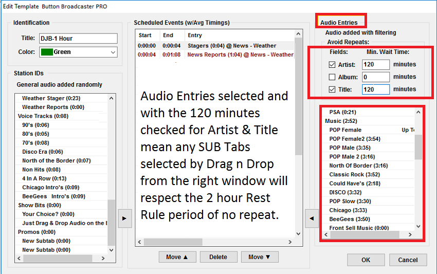 CAUTION: Make certain that there is enough audio inventory from various artists in the SUB Tab to allow BBPro Scheduler to pick other music than those