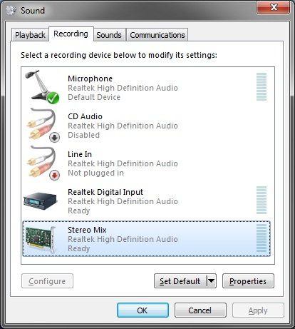 7. Once the device is set as default you will be able to use the "What U Hear"/"Stereo Mix" option in your applications to record the audio you are currently hearing over your speakers/headset.