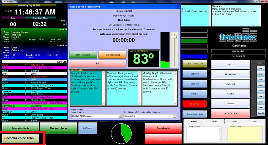 Voice Tracking in the Digital JukeBox is simple to manage and best are the fantastic results. As you can see by the screen below, when you press the voice track button, Voice Track Menu will show you the previous song, next song, the number of seconds to at least talk if you want to hit the post (intro marker) of the next song perfect and the approximate time past the hour that this voice track will air.
