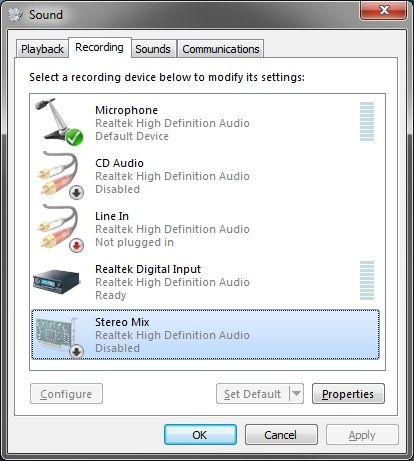 7. Once the device is set as default you will be able to use the "What U Hear"/"Stereo Mix" option in your applications to record the audio you are currently hearing over your speakers/headset.