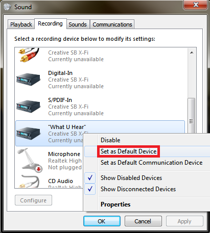6. Right click on the What U Hear option (Stereo Mix for non Sound Blaster devices) and click on Set as default device.