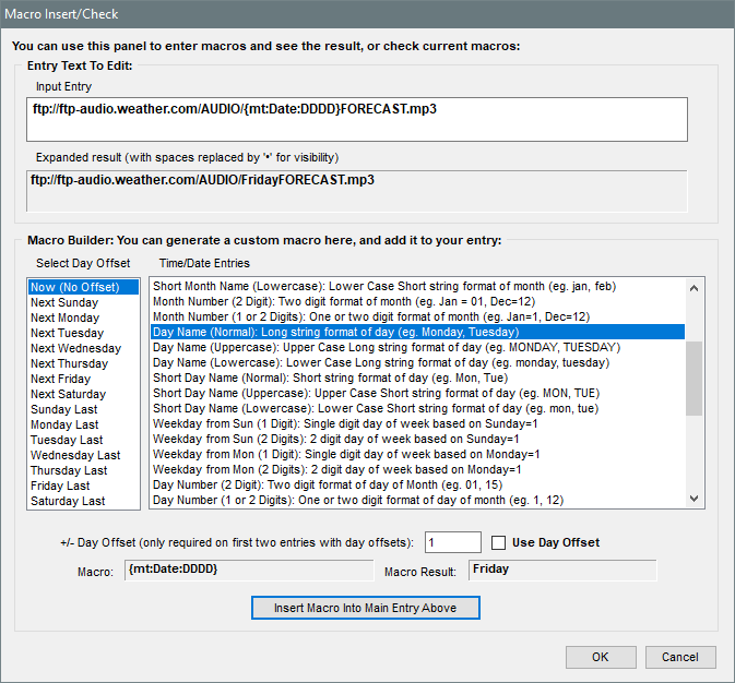 At the bottom of the window is a Macro box showing what the selected Time/Date Entry looks like and a Macro Result box that shows the result.