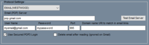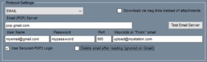 · EMAIL is a protocol to check your email for attachments, and download specific ones, creating a list of files to transfer. Unlike the other protocols, there is no URL; instead, you include a POP server name, an email address, and a password.