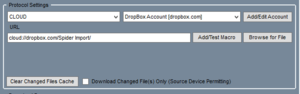 · CLOUD allows you to download files from a DropBox account or Google Drive. When you first set it up, you will need to click Add/Edit Account, select either the DropBox or Google tab, give the account a nickname and then click the Authorize button. Dropbox will have you login to your account and provide a code to copy and paste into Spider. Google will tell you the page is unsecured and you will have to go there anyway to authorize. Once an account is authorized it will appear in the second dropdown box. Then you can browse the directory structure the same way you would for an FTP site.