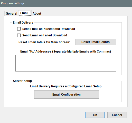 · Send email on Successful Download/Send email on Failed Download. These checkboxes turn off and on email sending.