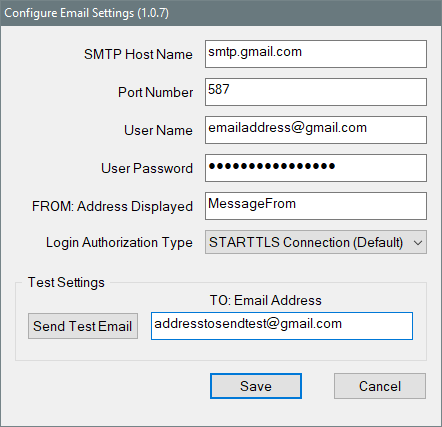 · Server Setup. Your email server information needs to be set up to send emails. Note that the button will display an alert until it is set up properly. On the email setup dialog below, configure the email server settings, such as port number, SMTP or POP server, address, etc. You can also test your settings by sending an email to an address of your choice. This is highly recommended, to confirm all the settings are correct before saving them. If you are unsure of the settings contact your email provider. Many common providers' settings can be found by Googling the provider's name and "SMTP server settings." Note: Gmail may require you to use an App password instead of your email password.
