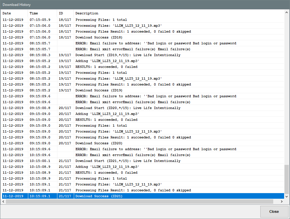 If you have errors downloading or transferring content, this dialog shows all system messages for the program and includes not only the current day's entries but the previous day's as well. System processes are listed in chronological order, with the oldest entries at the top.