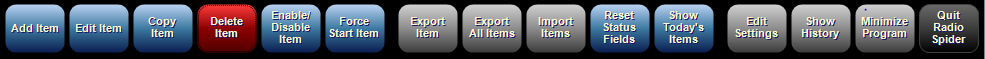 · Quit Radio Spider. This button shuts the program down immediately. Note that, unlike most programs, the Red 'X' on the system bar does NOT shut down the program, but instead minimizes the program to the taskbar in the tray icons section, where it will continue to run.