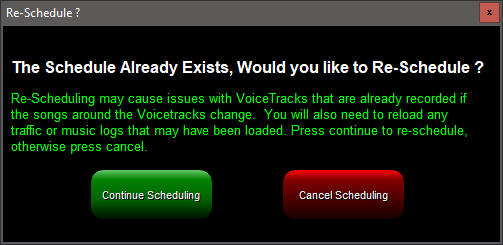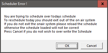 The exception to this is if you attempt to reschedule today's log and the OnAir software is using it. Then you will see this warning: